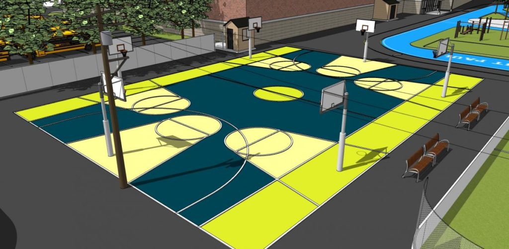 -Terrain asphalté de basket-ball peinturé à l’acrylique comprenant 6 paniers