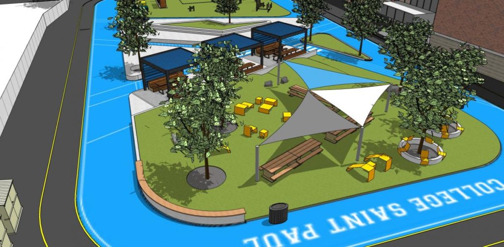 « Un des plus beaux projets de cour extérieure de la Montérégie puisqu’elle renfermera des classes extérieures flexibles, plusieurs espaces de rassemblement, de détente et de discussions et plusieurs espacesportifs. Du jamais vu! », Sophie Laflamme, directrice des services éducatifs du collège Saint-Paul.
